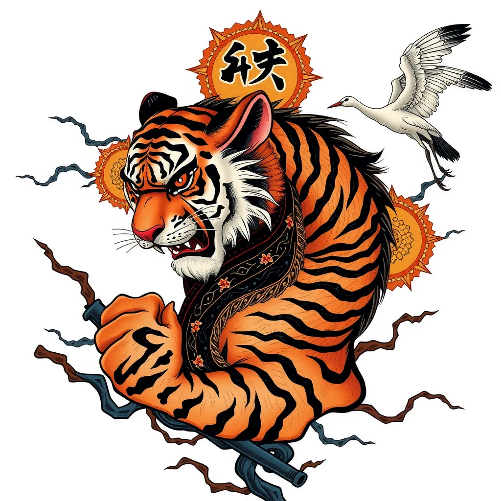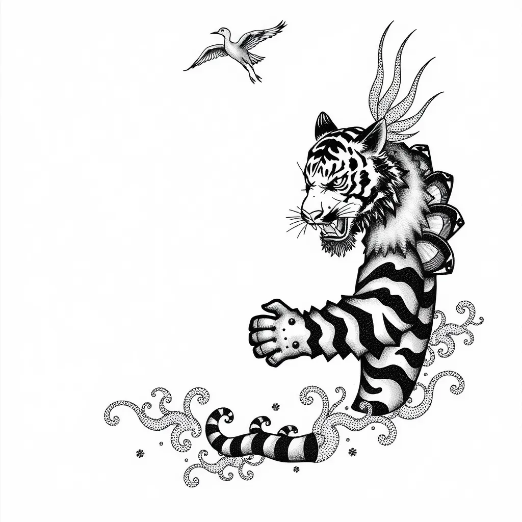 虎纹半甲 + 仙鹤剪影 / 祥云点缀 纹身